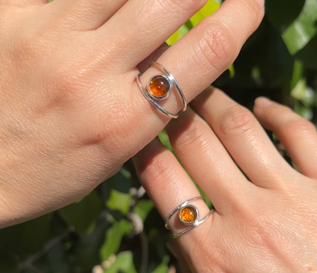 This ring features stunning amber set in between two silver bands. A perfect everyday ring to compliment your style.